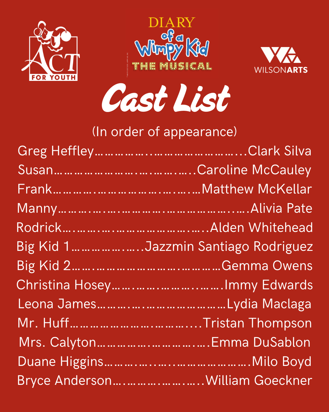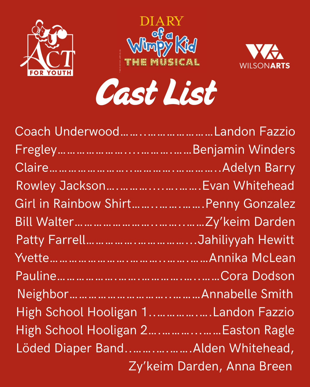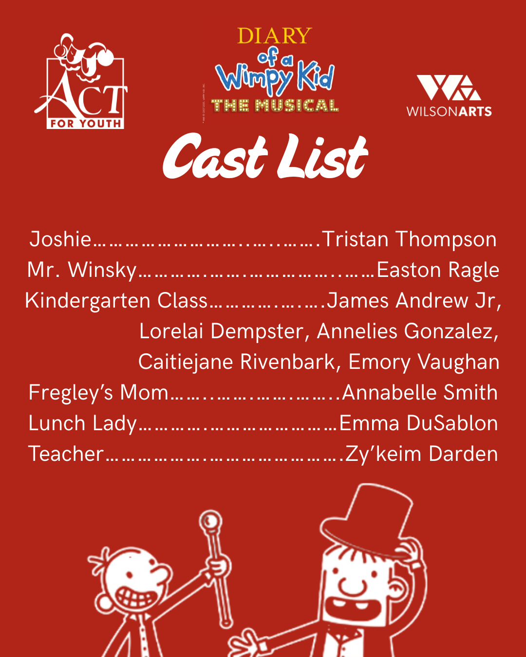 PLEASE NOTE: ACT! for Youth programs are open to children in kindergarten through high school who live in Wilson County, or whose parent(s) live or work in Wilson County, or those who are contributors to Wilson Arts at the family level or greater. THESE CRITERIA MUST BE MET IN ORDER FOR YOUR CHILD TO BE CAST IN THIS PRODUCTION.