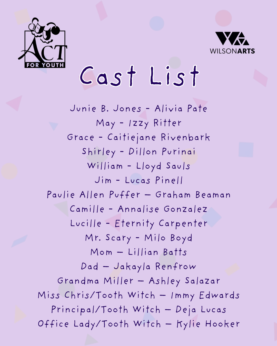 Cast lists will be publicly released soon. If you have any questions, please contact Theater Arts Coordinator Thomas Mauney at thomas@wilsonarts.com or by phone at 252-291-4329 x106.