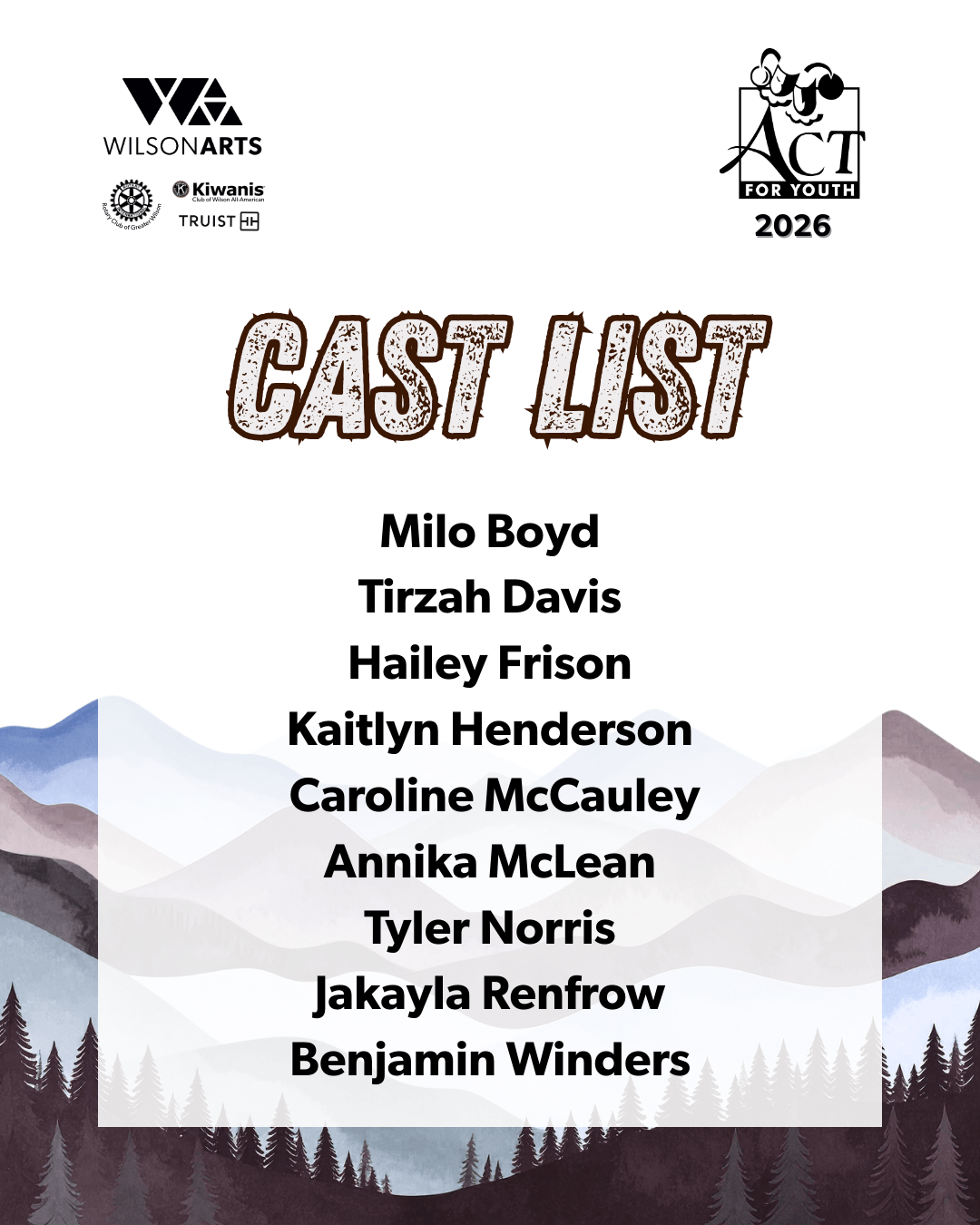 Auditions have been held for all 2026 Spring productions with ACT! for Youth
