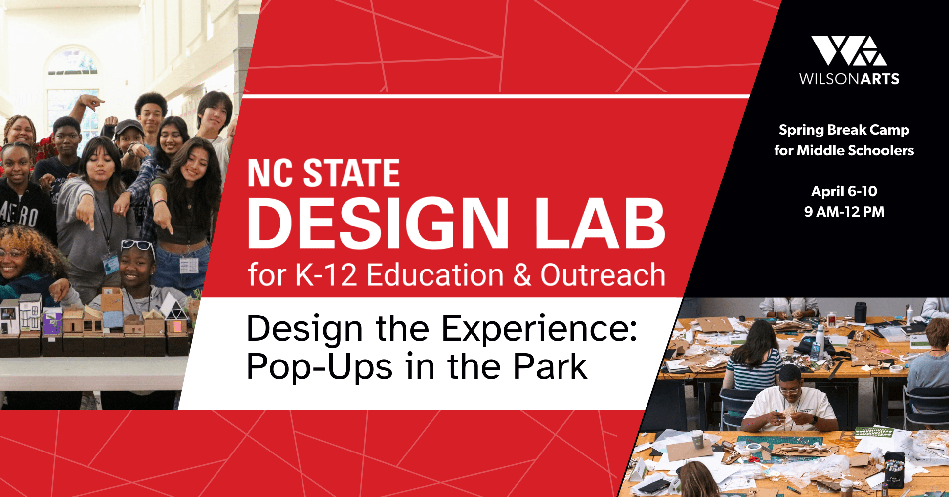 The Design Lab for K–12 Education & Outreach at NC State University’s College of Design is excited to partner with the Wilson Arts Center to offer Design the Experience: Pop-Ups in the Park, a week-long half-day program designed for middle school students who enjoy being creative, asking questions, and exploring potential creative career paths.